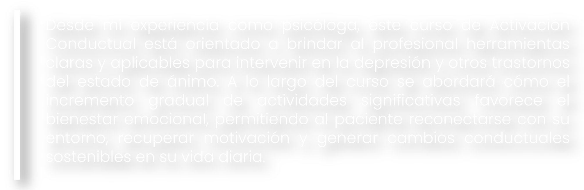 El curso propone un recorrido por los fundamentos que sustentan esta perspectiva, desde sus raíces conductistas hasta su consolidación dentro de la psicoterapia contemporánea. El análisis funcional de la conducta, la programación de actividades placenteras y el estudio de fenómenos como la evitación o la rumiación revelan cómo los patrones internos influyen en la estabilidad emocional.
